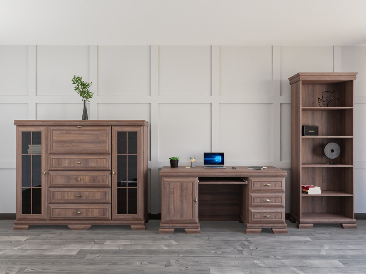 Αυτή η συλλογή κλασικού στυλ απευθύνεται σε όσους εκτιμούν το διαχρονικό σχεδιασμό και την κομψότητα. Τα έπιπλα της συλλογής είναι διακοσμημένα με μεταλλικές λαβές μοναδικού σχεδιασμού, δίνοντας σε κάθε κομμάτι μια πολυτελή εμφάνιση. Ένα από τα πιο σημαντικά χαρακτηριστικά αυτής της συλλογής είναι ηανθεκτική στις γρατζουνιές επιφάνειά της, η οποία εξασφαλίζει την αντοχή των επίπλων στο χρόνο. Ακόμη και μετά από πολλά χρόνια συνεχούς χρήσης, τα έπιπλα αυτά θα διατηρήσουν την άψογη εμφάνισή τους. Αυτή η συλλογή δεν εκπέμπει μόνο κομψότητα, αλλά δίνει και έμφαση στη λειτουργικότητα. Τα ράφια και τα συρτάρια είναι ευρύχωρα, εξασφαλίζοντας ότι θα έχετε αρκετό χώρο για να διατηρείτε τα πράγματά σας οργανωμένα. Ο συνδυασμός κλασικού στυλ και πρακτικότητας εξασφαλίζει ότι αυτή η συλλογή δεν θα διακοσμήσει μόνο το χώρο σας αλλά και θα βελτιώσει την ποιότητα της καθημερινής σας ζωής. Απολαύστε την ομορφιά του κλασικού στυλ και φέρτε τη διαχρονική κομψότητα στο σπίτι σας.
